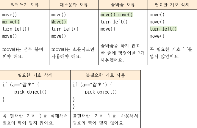 • 주로 띄어쓰기를 잘못하거나 대소문자를 지키지 못했을 때, 줄바꿈을 하지 않았을 때, 꼭 필요한 기호를 지우거나 불필요한 기호를 넣었을 때 발생한답니다.