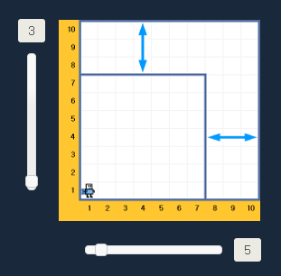 월드 꾸미기 화면에서 보이는 작은 점들 사이의 선을 마우스 왼쪽 버튼으로 클릭하면 짙은 색으로 벽이 그려지고, 마우스 오른쪽 버튼으로 클릭하면 옅은 색으로 문이 그려져요. 벽과 문은 로봇이 부딪쳐 고장 나지 않도록 피해 다녀야 하는데, 벽과 다르게 문은 로봇이 열고 닫을 수도 있답니다. |