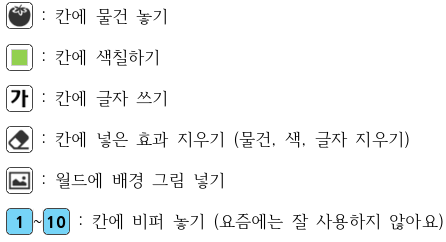 월드 크기가 변경되었으면, 7가지 요소(벽, 문, 색상, 물건, 비퍼, 글자, 배경그림)를 이용해서