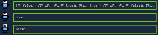 print("!는 false가 입력되면 결과를 true로 하고, true가 입력되면 결과를 false로 한다.")print(!false)