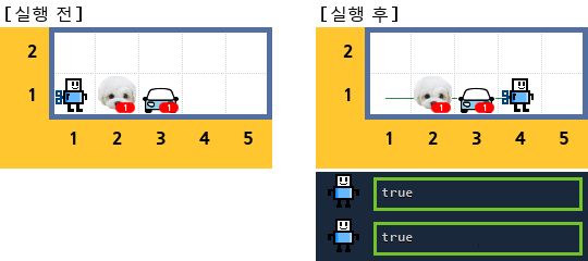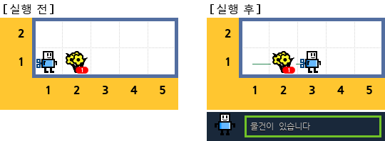 로봇이 위치한 칸에 물건이 있는지 없는지 알아내는 명령어이다.물건이 있으면 true, 없으면 false를 얻는다.